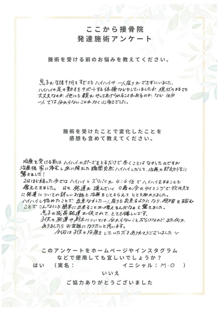 治療を受ける前はハイハイのポーズをとるだけで動くことはなかったのですが、治療後家に帰宅し床に降ろした瞬間突然ハイハイしだして、治療の即効性に驚きました!2日ほど経った今ではハイハイとズリバイが4:6位でハイハイをすることも増えてきました。日々発達が進んでいく0歳の今のタイミングで、牧田先生に発達についての詳しいお話と治療をしてもらえてとても助かりました。
